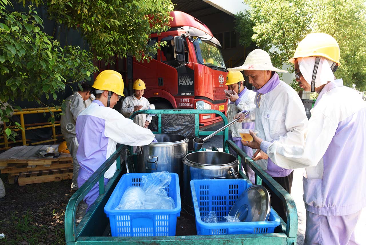 烈日炎炎,酷暑難擋,集團(tuán)公司廣大員工堅守崗位,奮戰(zhàn)高溫。今天下午,總務(wù)部開始為高溫一線員工送上涼爽可口的消暑湯。和往年一樣,氣溫在35℃以上的日子,總務(wù)部將在每天下午把解暑湯送到生產(chǎn)現(xiàn)場,冰鎮(zhèn)綠豆、銀耳羹、蝦皮咸菜湯……品種每天有變化,讓員工在酷暑天感受到公司的關(guān)懷。保持旺盛干勁。